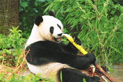 大熊貓“汪佳”正在啃食竹筍。