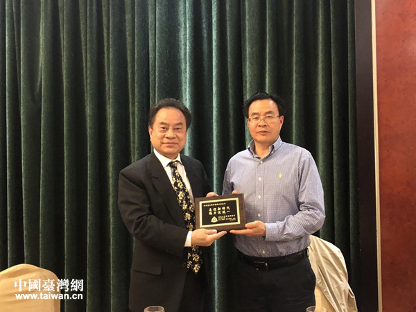 美東臺灣客家聯誼會會長陳達孝(左)贈送四川省臺辦、省臺聯“喜迎新時代,竭力促統一”牌匾。