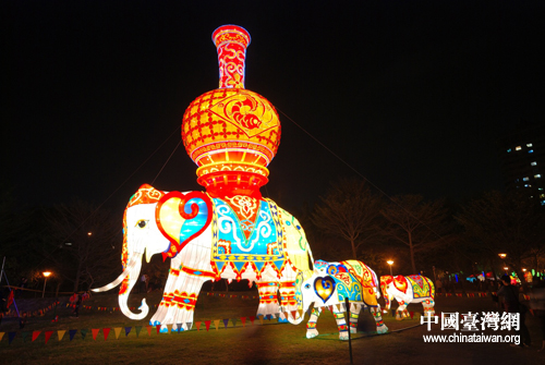 中國臺灣網3月13日臺中消息 2013年2月18日至3月3日,中臺灣元宵燈會在臺中市文心森林公園舉行,吸引臺灣民眾560萬人次前往參觀。四川自貢彩燈繼去年首次亮相2012中臺灣元宵燈會即驚艷全島后,今年蛇年春節,再度受邀赴臺參展,特制了《吉祥平安》、《龍鳳呈祥》、《國色天香》三組特色彩燈為2013中臺灣元宵燈會再增光彩,其中《吉祥平安》大型象形花燈光彩奪目,在臺灣民眾中更是再次引起轟動。