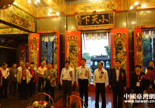 中國臺灣網11月7日泰安消息 日前,赴臺參加“2013臺灣·山東周”活動的泰安市經濟文化交流團一行來到位于臺南善化區小新里的善化東岳殿,舉辦了“泰山印象——泰山麗景特展暨泰安市人民政府惠贈泰山攝影圖片”活動,由泰安市委副書記、市長王云鵬率領的交流團全體成員、臺南市議員李文俊、善化東岳殿全體理事以及來自臺南、高雄、屏東等地11所宮廟的宮主、主委和信眾100多人參加活動,受到當地民眾的熱情歡迎。