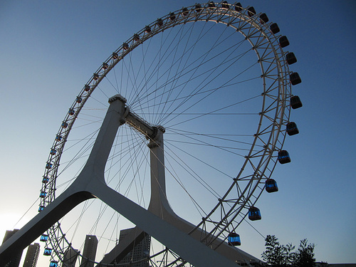 “天津之眼”是海河永樂橋(原慈海橋)上的摩天輪。摩天輪直徑為110米,相當于35層樓高,是世界上唯一一座建在橋上的摩天輪。永樂橋摩天輪共有48個透明座艙,每個座艙最多可坐8人,整個摩天輪可同時供380余人觀光,勻速轉動一圈大約需要30分鐘。 永樂橋位于海河源頭三岔河口的黃金區域,毗鄰鼓樓商貿文化區,與中國北方最大的小商品集散市場——大胡同商貿區相距不遠。同時,河岸左側的萬象輕紡城、鳳凰商貿城和大悲禪院也能吸引八方游客。