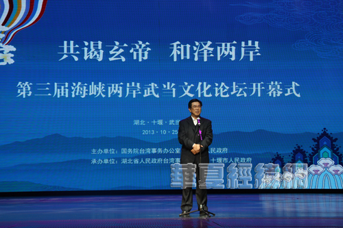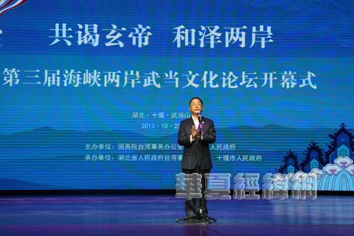 華夏經緯網10月26日訊:25日晚,第三屆海峽兩岸武當文化論壇在武當山太極劇場舉行開幕儀式。出席開幕式的重要嘉賓有海峽兩岸關系協會副會長蔣耀平、臺灣海峽交流基金會副董事長高孔廉、湖北省第十屆政協副主席陳柏槐、中共十堰市委書記周霽。