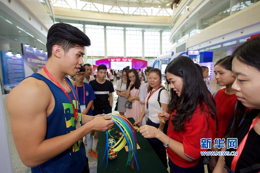 8月13日,在福州舉行的第四屆海峽青年節上,表演編織技藝的臺灣成功大學學生李庭瑋(左一)吸引眾多圍觀者。