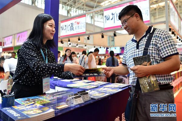 7月5日,在天津梅江會展中心,參展商工作人員(左)向觀眾發放招商材料。當日,第十一屆津臺投資合作洽談會暨2018年天津·臺灣商品博覽會在天津梅江會展中心拉開帷幕。 新華社記者李然攝