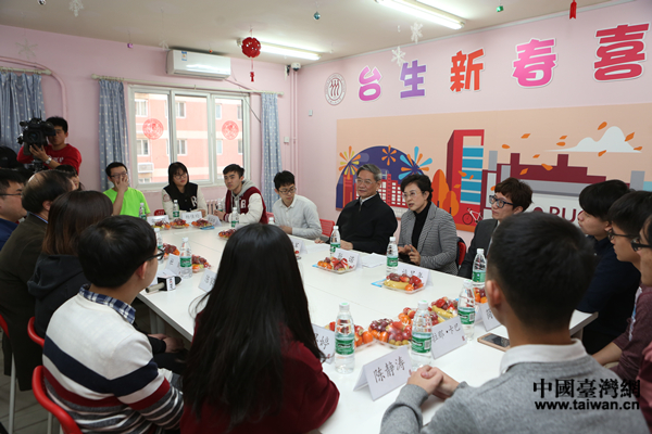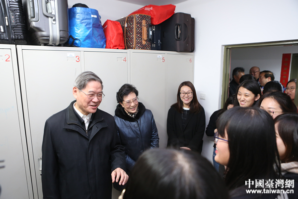 室外寒風刺骨,屋里暖意融融、笑聲陣陣。張志軍與人民大學黨委書記靳諾一同走進國際關系學院2015級臺灣同學楊思婷與大陸同學同住的宿舍,查看生活服務設施,仔細詢問生活上有什么困難,學習成績如何,與大陸學生共同學習生活情況。在與張志軍的座談互動中,臺灣學生踴躍發言,講述選擇就讀人民大學的原因、在校學習生活和參加實習的豐富多彩、與大陸同學交流融合的感受,都表示來人民大學讀書是完全正確的選擇,收獲豐碩,并引以為榮。臺灣教師林承鐸分享了自己在大陸的讀書求職經驗,并用習近平總書記的話“打鐵還需自身硬”勉勵學弟學妹們。參加座談的大多數臺灣學生表達了希望畢業后繼續在大陸發展事業的意愿。