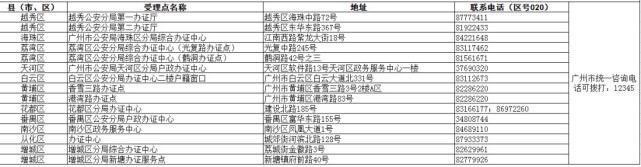 廣州市辦理受理點及聯系方式(如下圖)