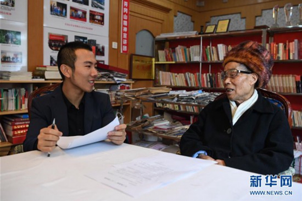 毛浩夫(左)向爺爺毛秉華請教黨史問題(2017年11月17日攝)。新華社記者 申宏攝