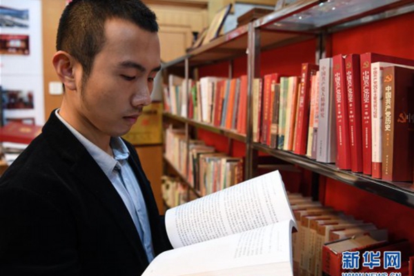 毛浩夫在翻閱黨史書籍,補充自己的黨史知識(2017年11月15日攝)。新華社記者 申宏攝