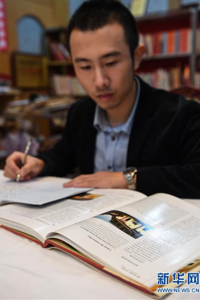 毛浩夫研讀有關井岡山的英文資料,豐富自己的英文講解素材。如果有外賓來參觀,他就用英文為外賓講解(2017年11月15日攝)。新華社記者 申宏攝