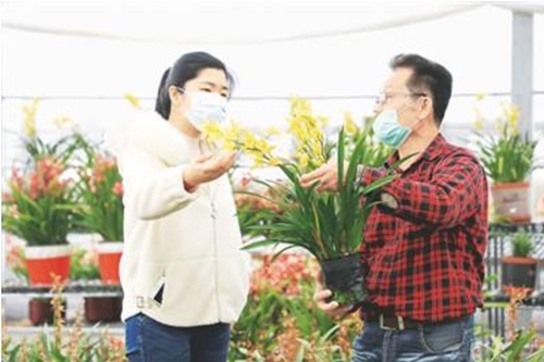 安徽廬江臺灣農民創業園開展“四送一服”活動,及時協調解決臺企復工復產中的困難和問題。圖為創業園工作人員(左)在臺企安徽蘭世界農業科技有限公司幫助落實小額貸款,解決蘭花銷售問題。柳曉華攝(人民圖片)