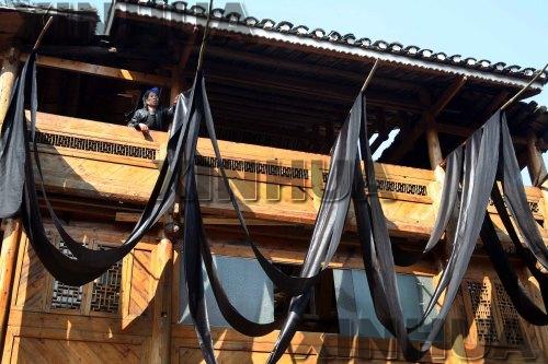 在貴州省從江縣谷坪鄉銀潭村,侗家婦女趁著好天氣在門前晾滿“亮布”。侗族服裝使用的“亮布”是一種經過染色的粗布料。這種布料的制作要經過浸染、捶布、晾布和涂抹雞蛋清等多道工序,工藝古樸,別具民族特色。新華社發(彭年 攝)