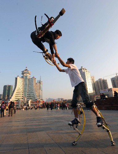 12月8日,幾名年輕人在貴陽市人民廣場穿著“彈跳鞋”進行健身運動。