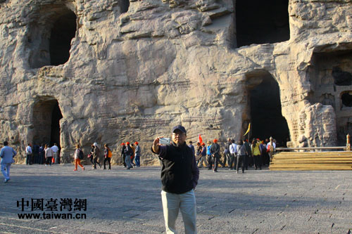 臺灣記者在云岡石窟拍照留念