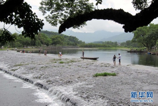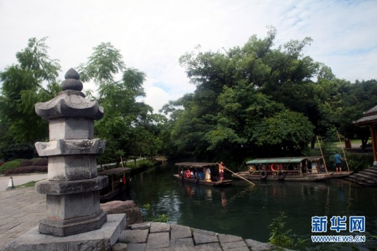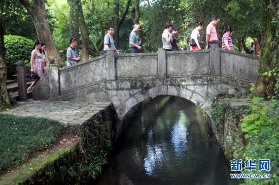 7月28日,游客從廣西桂林興安縣千年古靈渠旁的“狀元橋”上走過。廣西桂林境內的靈渠距今已有2200多年歷史,是現存世界上最完整的古代水利工程和最古老的運河之一,至今仍然發揮著灌溉作用。在當地政府的有效地保護下,如今的古靈渠生態優良,風景如畫,吸引各地游客慕名前來觀光旅游。 (王滋創 攝)