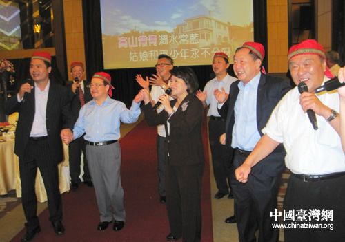 中國臺灣網8月24日嘉義消息 8月23日,在位于阿里山腳下的嘉義市耐斯王子大酒店舉行的歡迎午宴上,中國國民黨副主席、嘉義市長黃敏惠邀請到訪的江西省長鹿心社一行攜手共唱臺灣著名歌曲《阿里山的姑娘》,充分展示出兩岸同胞的深情厚誼。(中國臺灣網、江西省臺辦聯合報道)