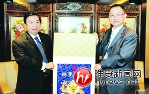 劉永忠(左)向焦佑鈞贈送漣水縣生產的云錦