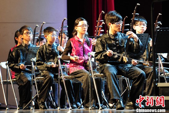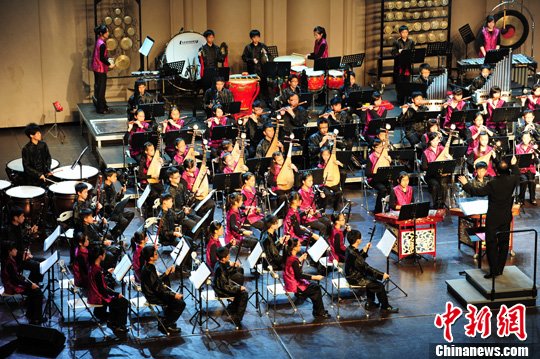 由98名臺灣青年學(xué)生組成的臺灣經(jīng)典青少年國樂團12日晚來到沈陽遼寧大劇院,經(jīng)過半年時間排演的“臺灣經(jīng)典兩岸情緣”的音樂專場演奏在這里首演。圖為團員們在演奏。中新社發(fā) 于海洋攝