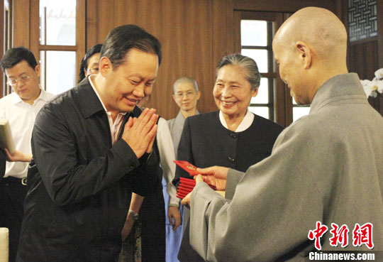 4月24日,佛教高僧證嚴法師在臺灣花蓮會見訪臺的中共廣西壯族自治區委員會書記彭清華一行。圖為證嚴法師向彭清華贈送;奂t包。中新社發 周群 攝