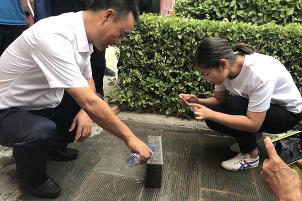 走進裴寨社區,正下著小雨,前來參觀學習的團體絡繹不絕。初見裴春亮,他在自己的家門前推銷著村里自產的海綿磚。裴春亮一邊演示還一邊說道:"你們看一眼,我就拿水管弄了一下,直接就能滲下去,我們這里有原材料,能把村里的資源都用起來。"