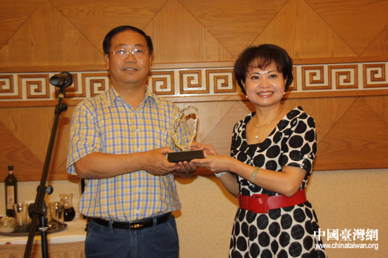 在7日晚間舉行的歡迎晚宴上甘肅省臺辦主任趙少智與臺灣知名人士王齡嬌交換禮物。(中國臺灣網 宿靜 攝)