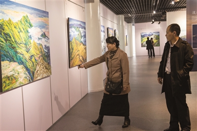 10日,由天津空港經濟區社會發展局、空港經濟區文化中心主辦,“登峰造極2015郭少宗臺灣百岳油畫展”在空港文化中心綜合展廳展出。據了解,此次活動共展出45件藝術家郭少宗的油畫“臺灣百岳”系列作品。本次展覽對公眾免費開放,展期為一個月,為普通百姓提供更多接近藝術和了解藝術的機會。圖為市民觀展。(記者 宏旭 文 周偉 攝)