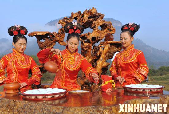 11月16日,三位姑娘在風光秀麗的武夷山大王峰下表演茶藝。 當日,第二屆海峽兩岸茶業(yè)博覽會在福建武夷山拉開帷幕。海峽兩岸6000多名茶商、茶農(nóng)以及茶業(yè)專家相聚武夷山下,以茶會友,共敘親情,以一脈相承的茶文化為橋梁和紐帶,拓寬旅游、經(jīng)濟等領(lǐng)域的廣泛合作,推動兩岸經(jīng)濟文化繁榮。 新華社記者張國俊攝
