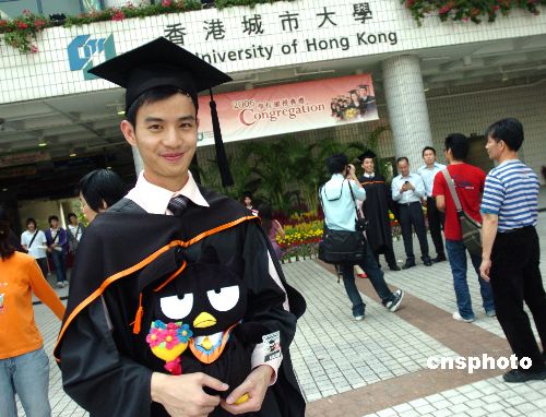 香港城市大學(xué)11月10日舉行2006學(xué)位頒授典禮﹐校園四處有獲得學(xué)位的畢業(yè)生一身學(xué)位服打扮留影﹐父母親戚左右相伴﹑鮮花相送﹐學(xué)生們個(gè)個(gè)展露開(kāi)心笑容。資料顯示﹐香港大學(xué)生就業(yè)職位數(shù)目較去年同期上升近12%。圖中一位會(huì)計(jì)科系畢業(yè)的學(xué)生懷抱卡通娃照相。 中新社發(fā) 王麗南 攝