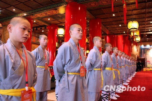 “中原文化寶島行”河南說明會十二月十六日在臺北圓山飯店舉行。圖為會前,來自河南嵩山少林寺的僧眾列隊歡迎與會嘉賓。 中新社發 曾嘉 攝