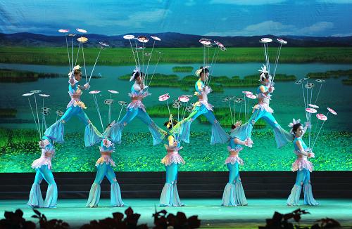 銀川市雜技團(tuán)的演員在表演《寧夏川好地方——轉(zhuǎn)花碟》(1月9日攝)。