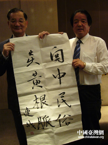 中國臺灣網6月23日西安消息 日前,陜西省人大文化交流訪問團赴臺灣參訪。中國國民黨榮譽主席連戰先生在臺北會見訪問團一行,并為陜西關中民俗博物院題字:“關中民俗,炎黃根脈”。(中國臺灣網、陜西省臺辦聯合報道)