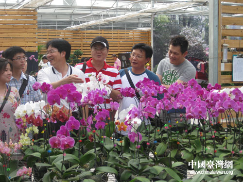 臺灣青年創業協會十杰基金會訪問團一行高興地談論這是“胡總書記今年參觀過的蘭花品種”。(漳浦縣臺辦 陳文亮 攝)