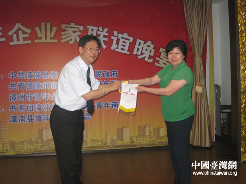 臺灣青年創業協會十杰基金會向漳浦縣副縣長王彩云(右)贈送“青年動手 人類希望”的圖標。(漳浦縣臺辦 陳文亮 攝)
