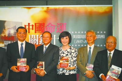 7月7日下午,臺當局“考試院長”關中(左二)在臺北舉行《中國命運,關鍵十年》新書發布會。該書是關中對1937年至1947年間的“美國與國共談判真相”進行研究而編成的,重現了當年對日抗戰、國共內戰談判等歷史場景。中國國民黨榮譽主席連戰(左一)等出席發布會。陳榮富 攝
