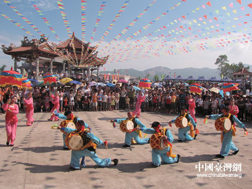漳浦特色民俗文化“大車鼓”在雨霽頂三界公廟進行熱情表演。(漳浦縣臺辦 陳文亮 攝)
