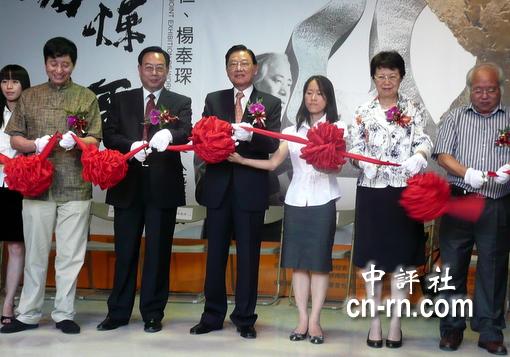 江炳坤(右四)、葉明(左三)及馮明珠(左二)一起為朱炳仁、楊奉琛兩岸雙人藝術(shù)展剪彩。(中評(píng)社 倪鴻祥攝)
