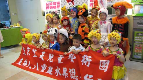 (記者吳亞明、徐蕾)在臺灣“8·8”風災周年之際,來自北京的藍天兒童藝術團今天在這里舉行了災區果樹認養活動。在臺北統一超商大樓的“7—11”ibon便利生活站,孩子們穿著可愛的七彩戲服,邊品嘗臺灣的各式水果,邊用童言童語推廣介紹,鼓勵大朋友、小朋友一同加入愛心認養隊伍,希望把愛傳遞到“8·8”災區。