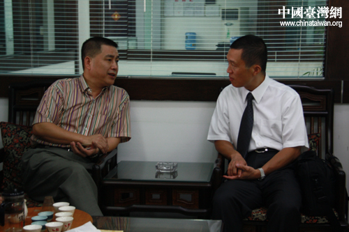 知名講師鄭琳鋒與飛鴻五金飾品有限公司總經(jīng)理陳建明進(jìn)行內(nèi)訓(xùn)前交流。(中國臺灣網(wǎng) 胡珊珊 攝)