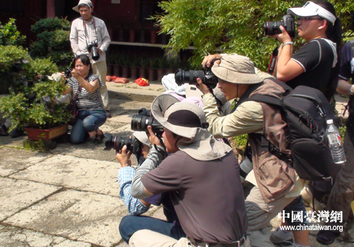 桃園縣攝影藝術協會的攝影家在調試鏡頭(圖片來源:舟山市臺辦)