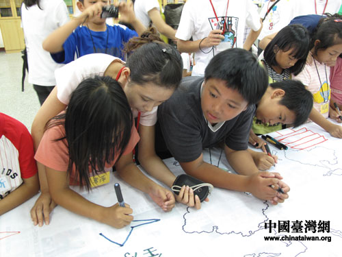 7月22日,廣西大學和臺灣大學學生和臺灣南投縣信義鄉仁和小學學生共畫“心目中的世博場館”。圖片來源:廣西臺辦