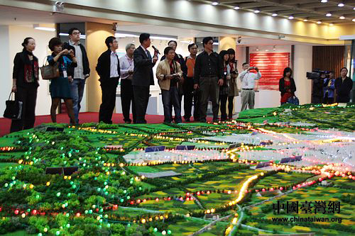 記者們站在成都市城鄉(xiāng)規(guī)劃總模型前興致勃勃。(中國臺灣網(wǎng) 馬迪 攝)