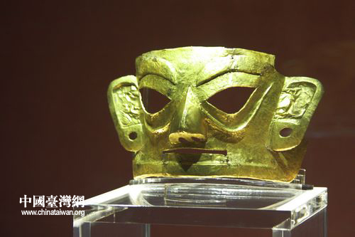 高11厘米、寬19.5厘米的黃金面具,是迄今大陸發(fā)現(xiàn)的保存最完整、最大的一件金面具。它陳列于金沙遺址博物館的“千年絕唱”精品文物廳中,與“太陽神鳥”互相輝映。(中國臺(tái)灣網(wǎng) 馬迪 攝)