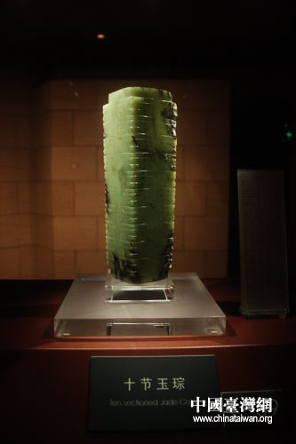 十節(jié)玉琮。由一塊質(zhì)地細(xì)密的上佳整玉雕琢完成,通體呈淡青綠色,九條細(xì)小的橫槽將器身分為十節(jié),每節(jié)棱角上均刻有紋飾。有專家認(rèn)為,此玉琮比金沙遺址更早1000年。(中國臺(tái)灣網(wǎng) 馬迪 攝)