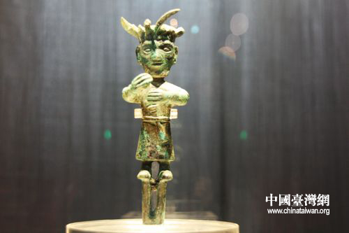 19.6厘米高的金沙青銅小立人,古樸精致。與三星堆出土的2米高青銅大立人有異曲同工之妙。(中國臺(tái)灣網(wǎng) 馬迪 攝)