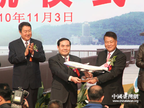 臺灣中華航空公司總經理孫洪祥向青島市副市長王廣正贈送飛機模型。(韓軍 攝)