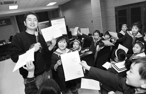 圖為漫畫家胖兔子粥粥與北京芳草地國際學校的小學生一起展示剛完成的漫畫。