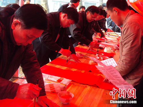 20日下午,海南省藝術(shù)家、書(shū)法獲獎(jiǎng)?wù)吆团_(tái)灣書(shū)法家在文昌開(kāi)展海峽兩岸書(shū)法家“送歡樂(lè)、下基層”義務(wù)揮春活動(dòng)。(完)(張茜翼)