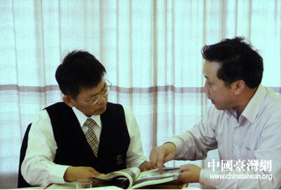 浦東新區臺辦副主任范桂國向楊秋興介紹浦東情況。圖片來源:浦東新區臺辦