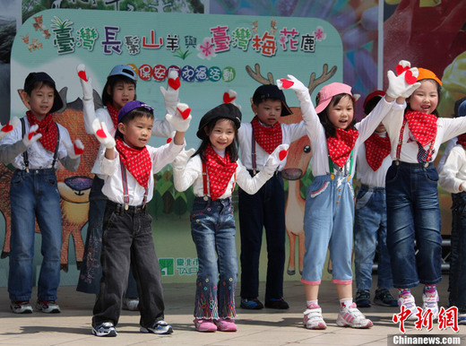 4月7日,臺北市立動物園為臺灣同胞回贈大陸同胞的長鬃山羊(“喜羊羊”和“樂羊羊”)和梅花鹿(“繁星”和“點點”)舉行祈;顒樱鼈兗磳⒃16日啟程赴山東劉公島。這場名為“永保安康——為長鬃山羊與梅花鹿祈!钡幕顒游私倜變簣@小朋友和小學生參加。圖為祈福儀式上,臺北小朋友跳起自編自演的動物舞蹈。路梅 攝