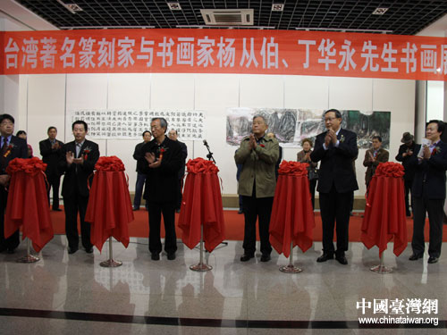 中國臺灣網4月12日煙臺消息 4月12日上午9點半,臺灣著名篆刻家與書畫家楊從伯、丁華永先生書畫展于煙臺市畫院隆重開幕,煙臺市委副秘書長、市臺辦主任孫迎軍,煙臺市文聯主席孫光輝等參加并剪彩。