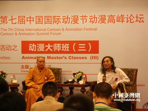 4月29日,臺灣著名漫畫家蔡志忠出席第七屆中國國際動漫節,與少林寺方丈釋永信一起“禪說動漫”。(中國臺灣網 李丹 攝)